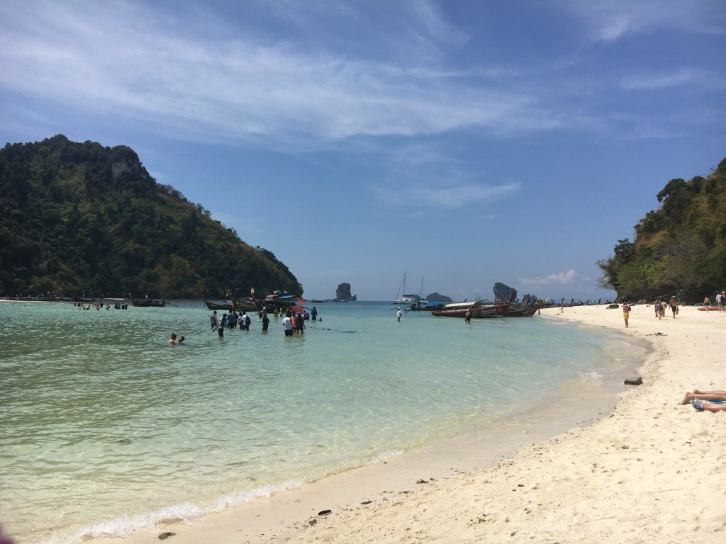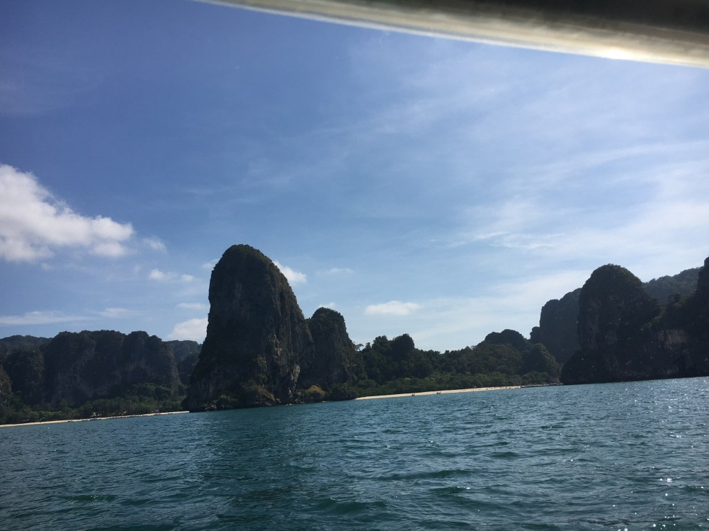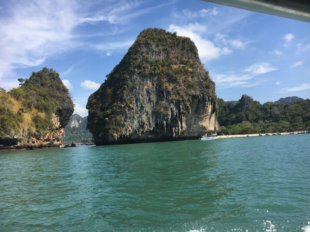 Railay, tap island, Chicken island and finally poda island. At Railay beach we had a snack. It was too hot to sit in the sun so we sat under trees in the shade. We saw people walking across a sandbank to visit another island as it was low tide. Back on the boat. You had to walk into the sea to climb on board. Mummy and Daddy both got wet but I was fine because they carried me.