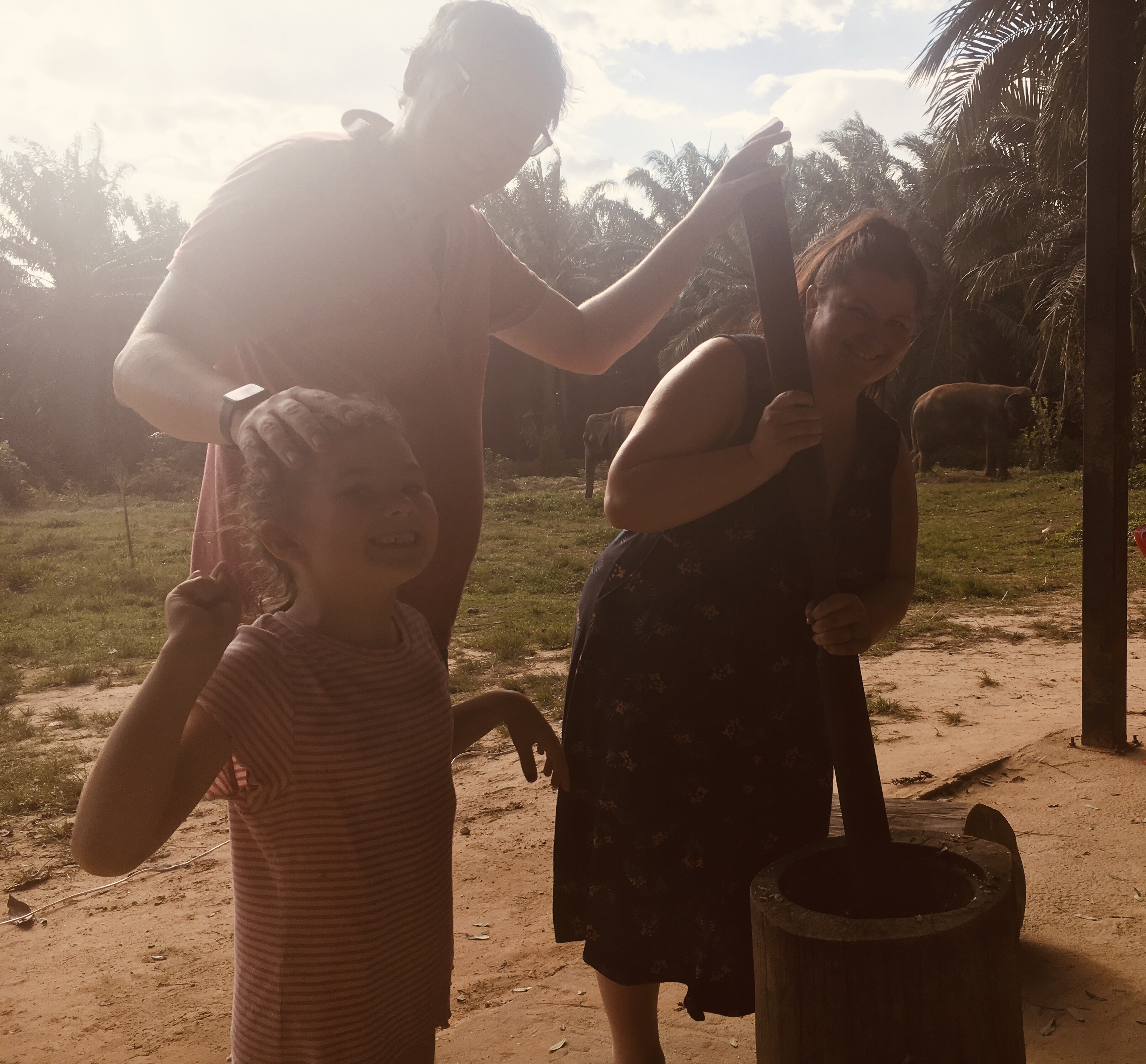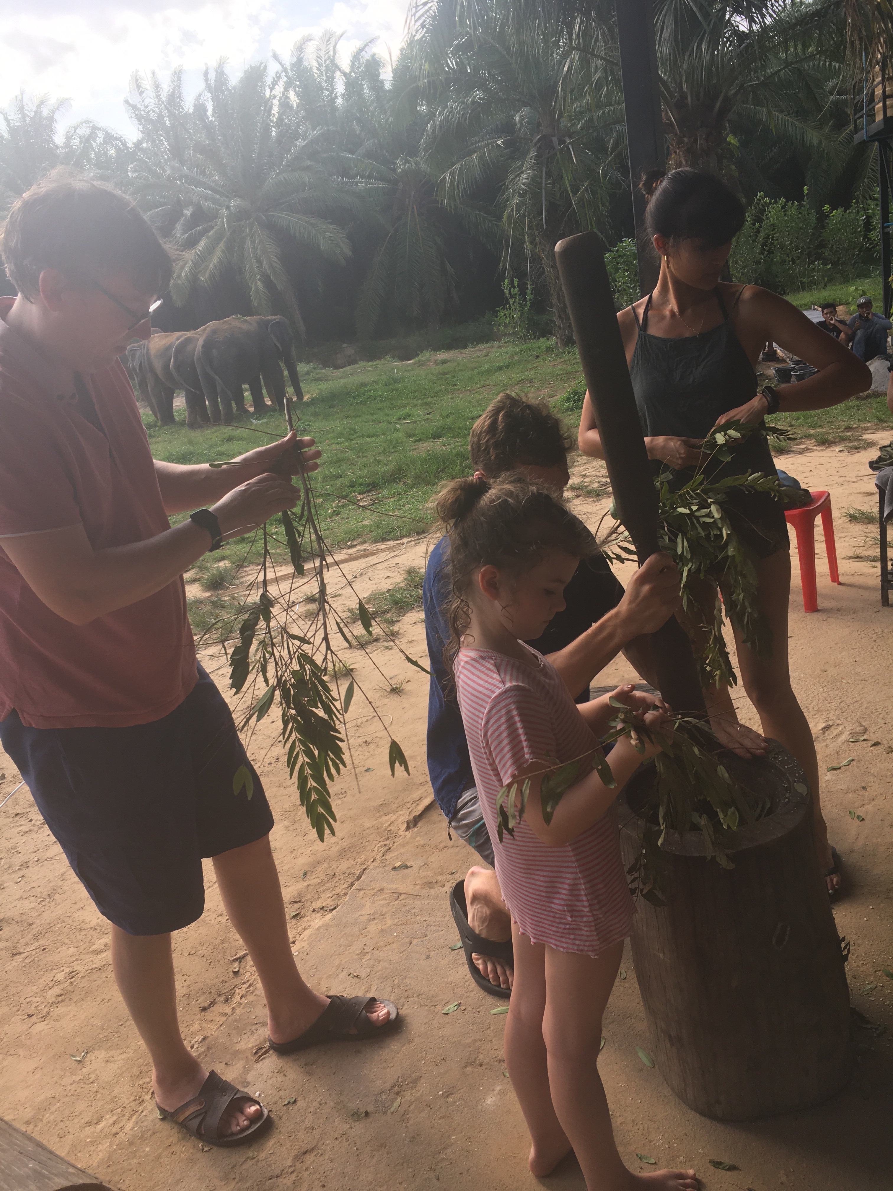 Then we got the ingredients to make medicine for them. There were special leaves that were very bitter that we had to mix in the medicine. We also had to mix in salt fruit and coconut sugar and a bit of water. We made it all into a paste using a massive bucket. We then fed it to all the elephants and I think it was very yucky because it was all sticky from the coconut sugar. And daddy tried some coconut sugar and it was very sweet but I thought that I shouldn’t because I think it would be wasting all of it.
