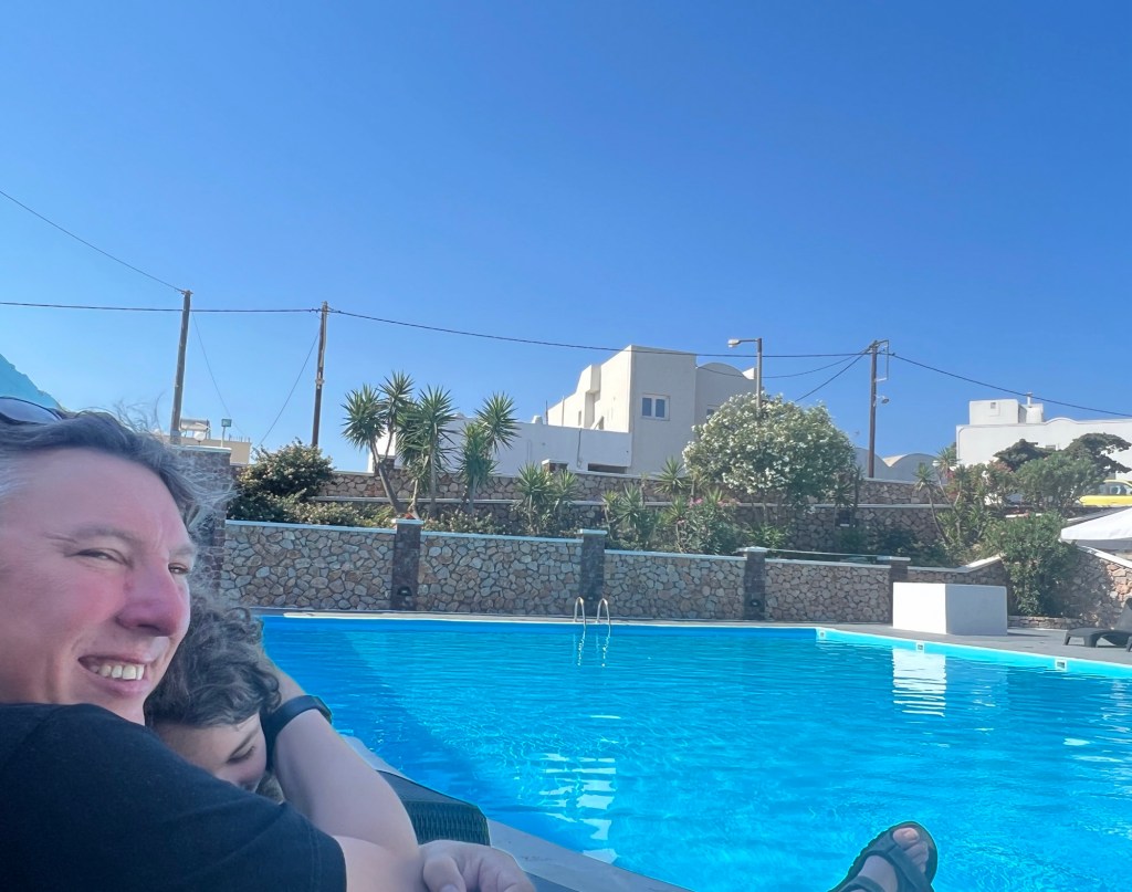 We got off the airplane late at night, even though it was midnight (00:09 to be specific) and a restaurant was still open!! So I got a lemon Fanta but mum and dad got red wine, and we got my favourite tsatziki and bread! I missed it because it’s not in England.. after that mum payed the bill and we went to the hotel, it was very fancy and the pool was MASSIVE. After we went to sleep. 😴💤🥱
