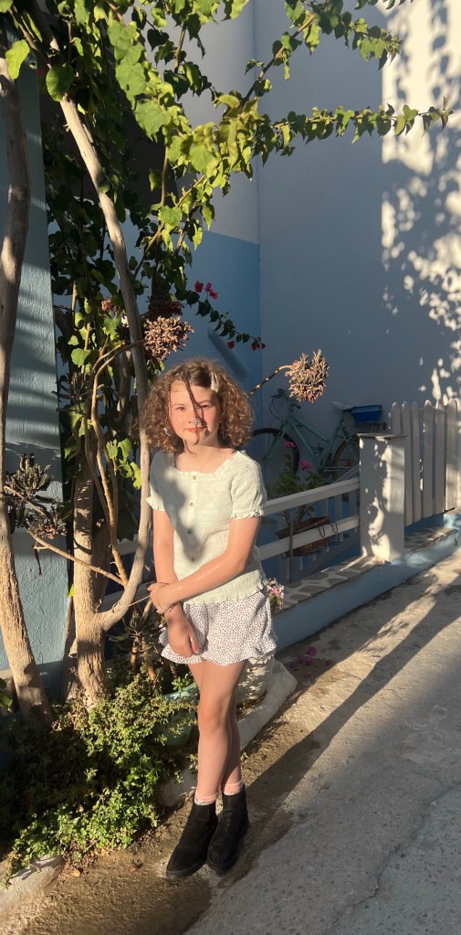 Then we had to organise our cases and go on a big ferry! To an island called Naxos. 🌴 it was a 2 hour journey and dad thought they had no food other than plain crisps but we explored upstairs and found slush and ice-cream! 🍦 when we got off it was a big walk and I was overheating and when we got there the nice receptionist gave us fresh lemonade and it’s near the st Georges beach! 🌊☀️🏝