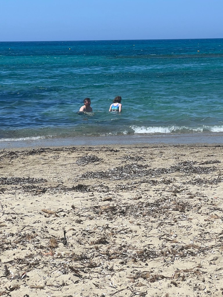 We woke up then sorted out our cases then had a little chillax on the balcony. After that we got changed and went to have lunch at manolo’s which was mum and dads fav restaurant when they took me to the beach when I was little, also one of dads favourite skordalia’s and the tsatziki. After lunch we walked the whole length of St. George’s beach until we reached the wind surfers. We found a little patch of fine sand to put our bags and towels down. We had a little paddle then me and dad went swimming, after I put on my new bikini. 😊