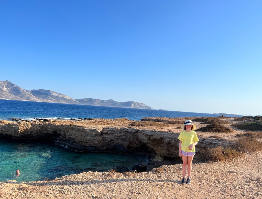 We got the ferry to Koufonissi. The man on the boat wouldn’t move his bag from the seat, so dad had to stand.