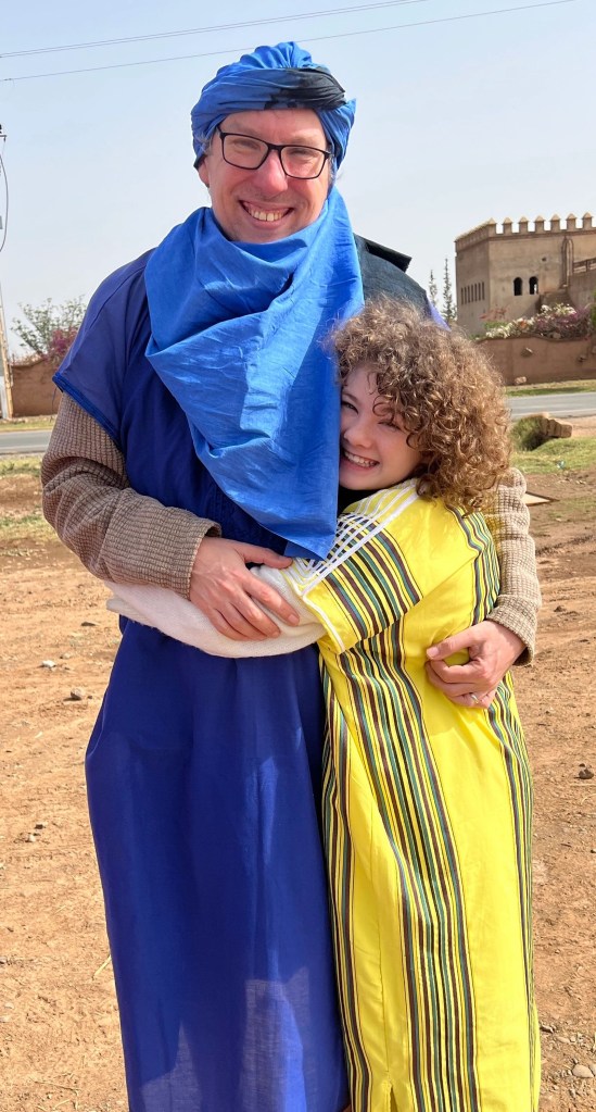 They’re not camels they are dromedarys but in our new hotel there are camels on the beach and the bright clothes nearly everyone got one we also got a head scarf thing