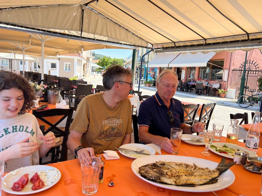After we went for lunch at Batis! The grownups ordered a huge fish and I had tsatsiki and salad. It was nice and since Kath and Cliff bought fish nets we could try catch some, but I didn’t catch any..