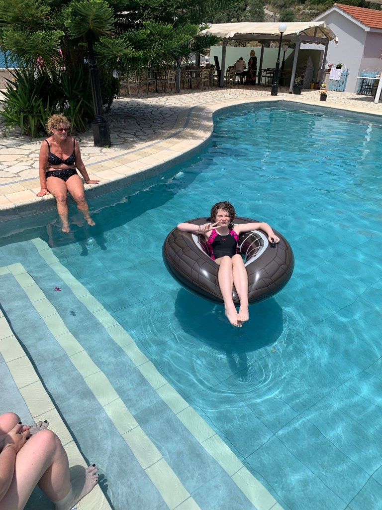 Today we went over to Kath and Cliffs apartment to have a dip in the pool, it was fun! We got to use the ring, which Dad and me liked.