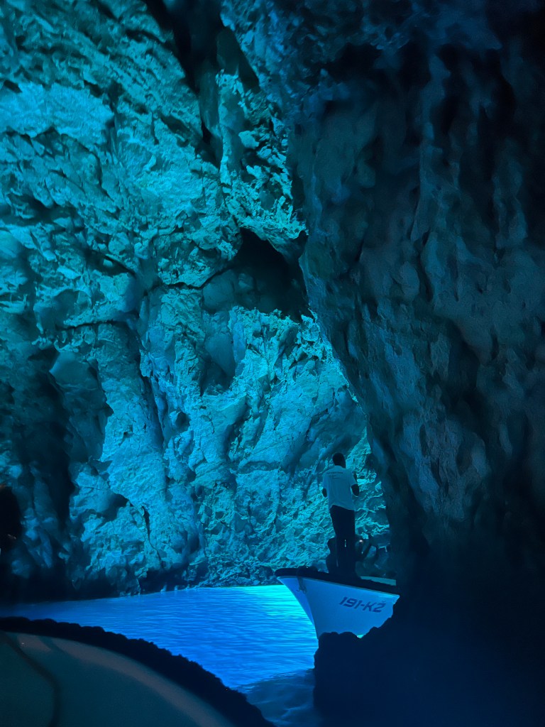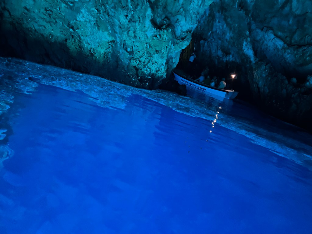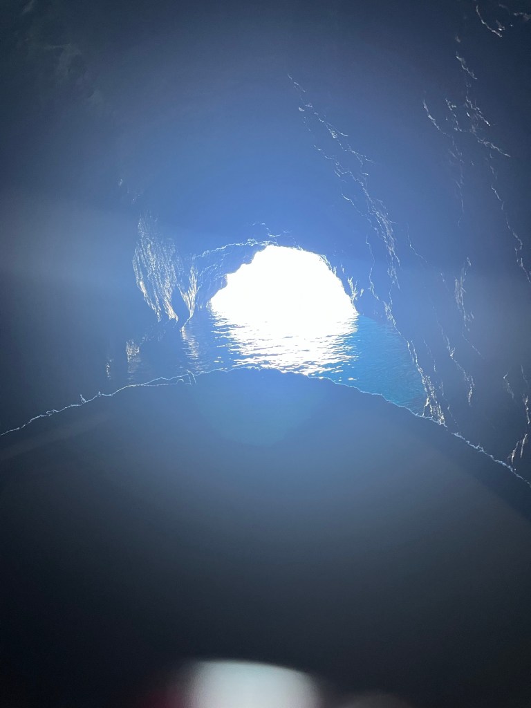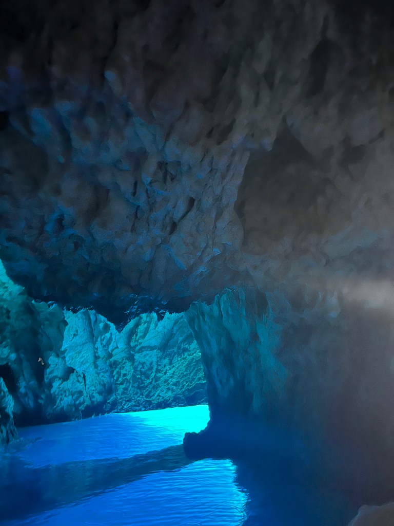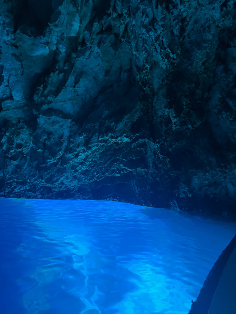 First we boated to the blue cave, we got a drink before getting on a new boat. We had to duck our heads to get inside, it was all natural!! It was very blue, it was a bit small but very pretty. The lady said if you see the heart shaped rock you are romantic, mum found it and so did Dad. I guess I am not romantic.☹️
