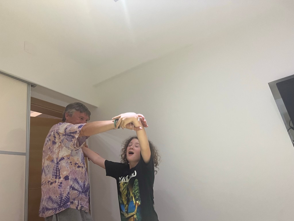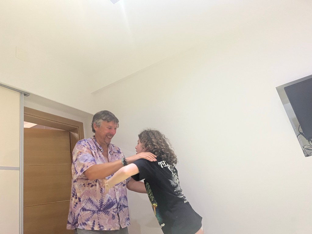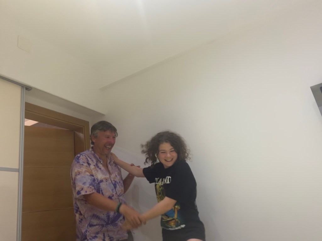 After we finished our meal we went to the beach and had a swim in the sea. It was quite wavy considering there’s a big storm coming tomorrow but anyway, I had to run back to the apartment to go get the floaty. Dad got out, then I got out and then mum got out.