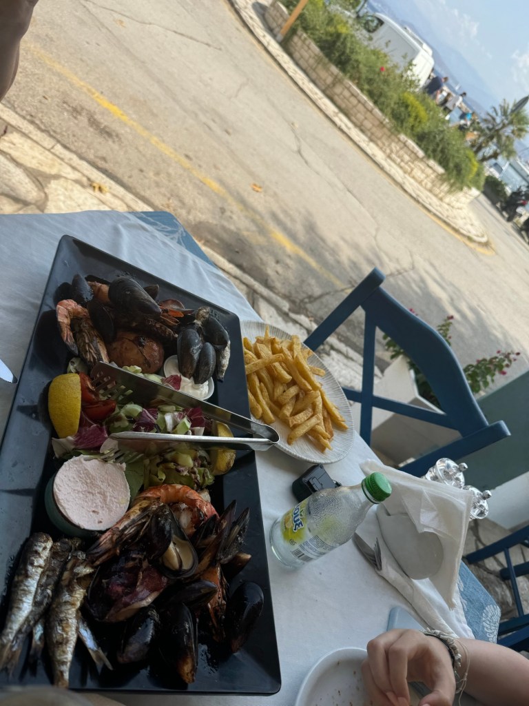 Today we went to a restaurant called Casiopia, it opened early for us since we were 20 minutes early. I had to try everything on the fish platter to get my beloved phone back, my favourite was the muscles and prawn. I de-spined a sardine!!! I also had to try squid, octopus, sword fish and baby calimari. I counted all of its legs and counted down as I bit them off, dad was in hysterics.