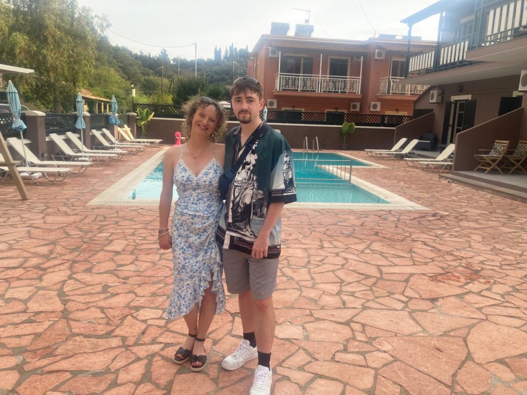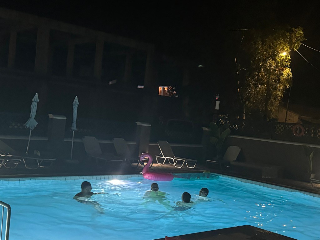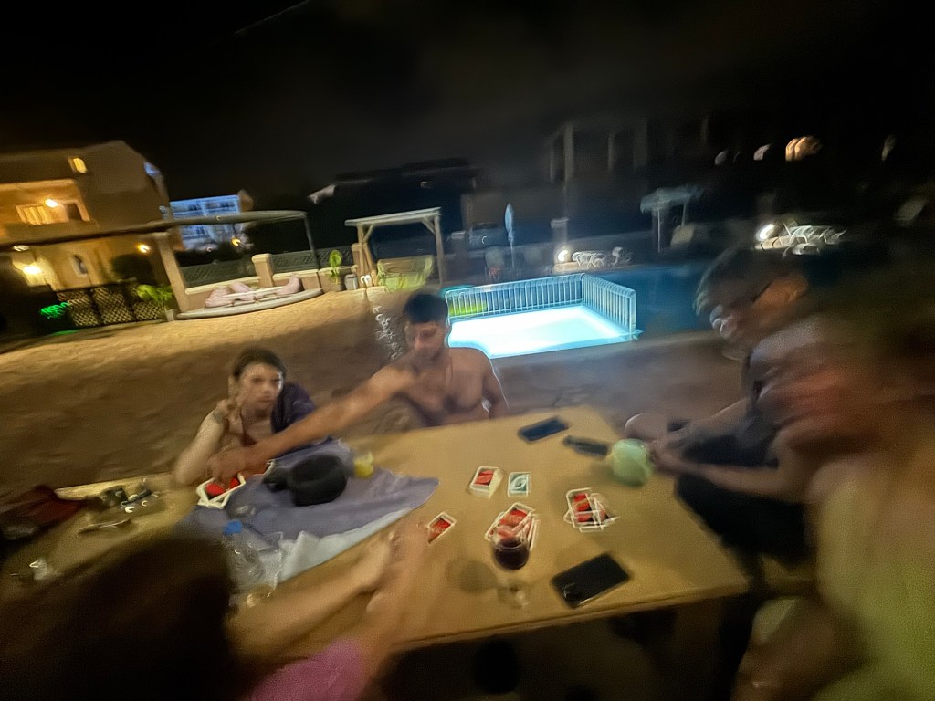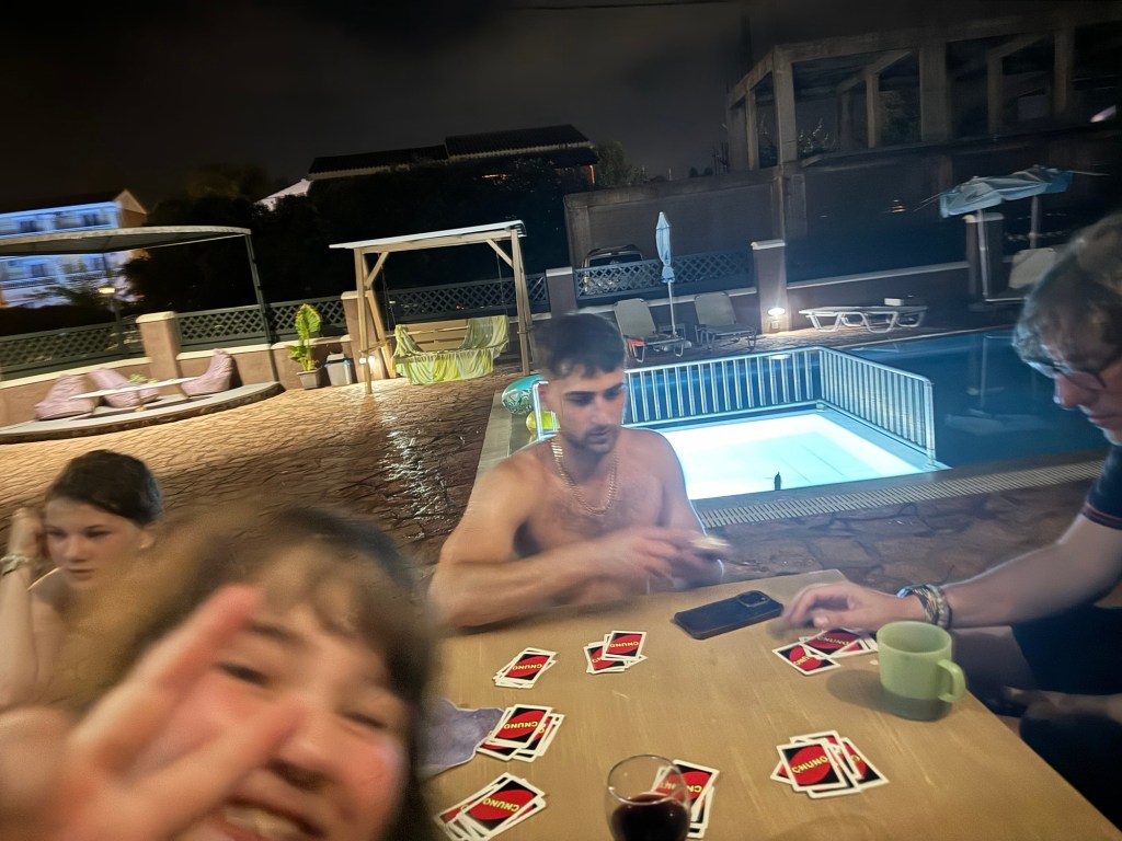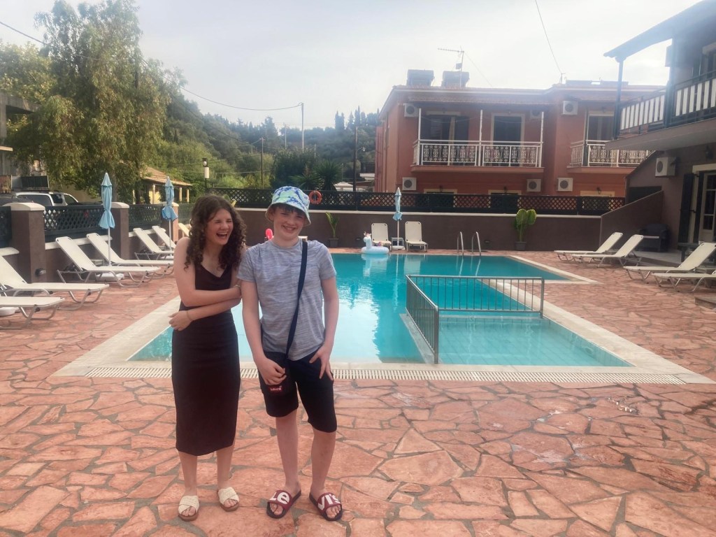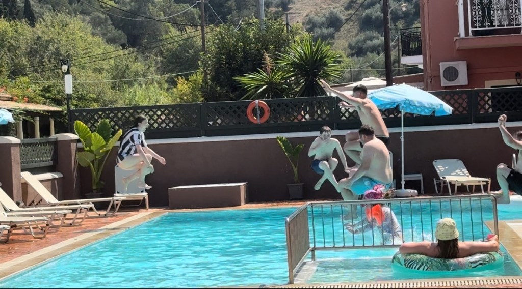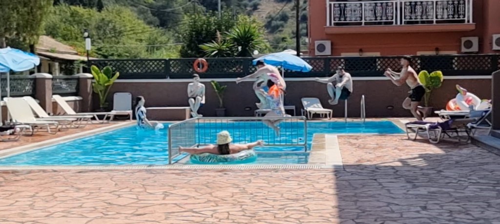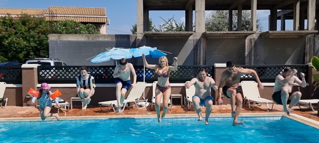 We walked back and went in the pool, dad walked along for gyros. Me and Oliver got in the pool and most of the grown ups went out.